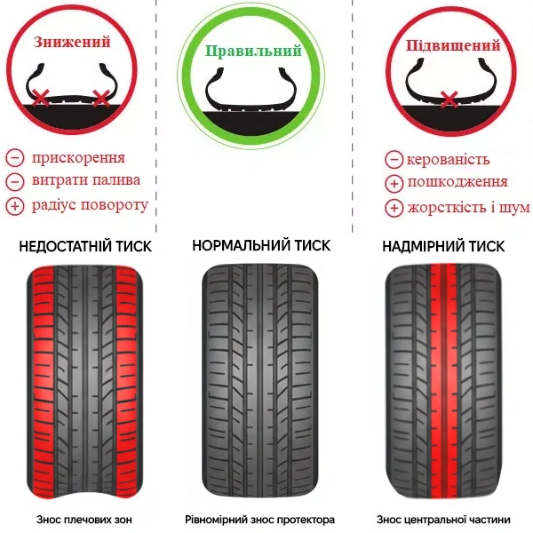 Правильний тиск у шинах напряму впливає на безпеку, витрату пального і рівномірний знос гуми. Занижений тиск збільшує опір кочення, перегріває шину і призводить до швидкого зношення бокової частини протектора. Завищений – погіршує зчеплення з дорогою і знижує комфорт їзди, зношуючи центр протектора.